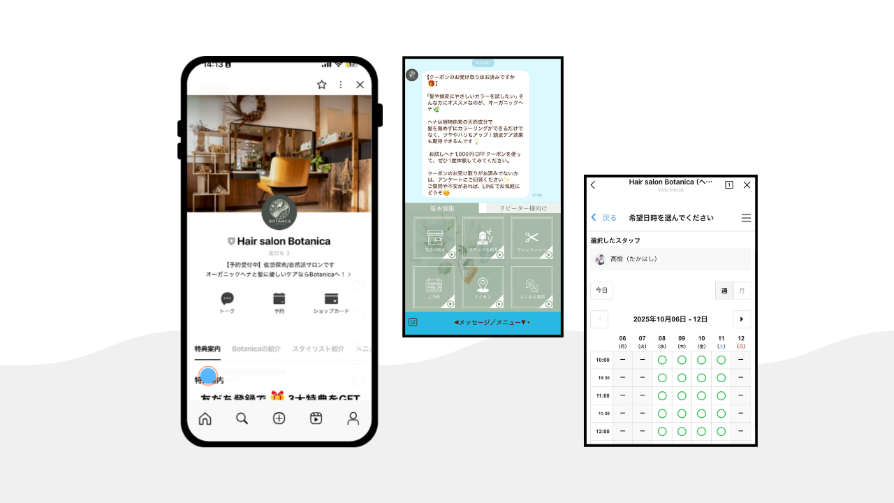 LINE構築_美容室 2025 10/08 LINE構築 ~美容室(架空)~ 業務内容 LINE構築全般 LINE公式アカウント開設 エルメ連携 リッチメニューや商品一覧デザイン(Canva) 予約機能設定 実装した機能 リッチメニュー あいさつメッセージ 商品一覧 自動メッセージ機能 クーポン ポイントカード 美容室予約 拡張ツール エルメ使用 登録して確認する ALL LINE構築 LINE構築_農家 LINE構築_車整備工場